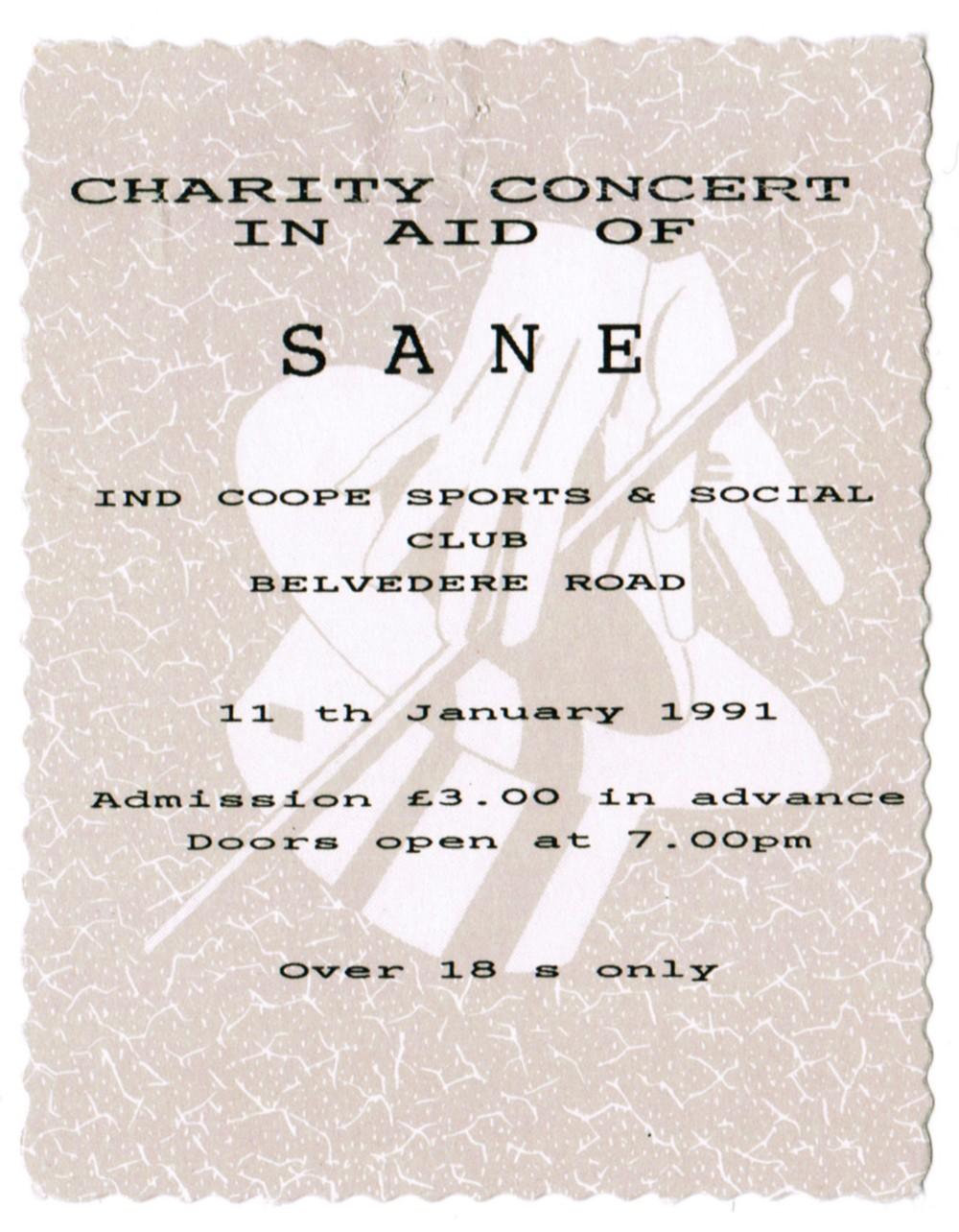 Title: Ticket for the SANE Benefit Gig at the Belvedere ClubDate: 11-Jan-1991 [Back]
